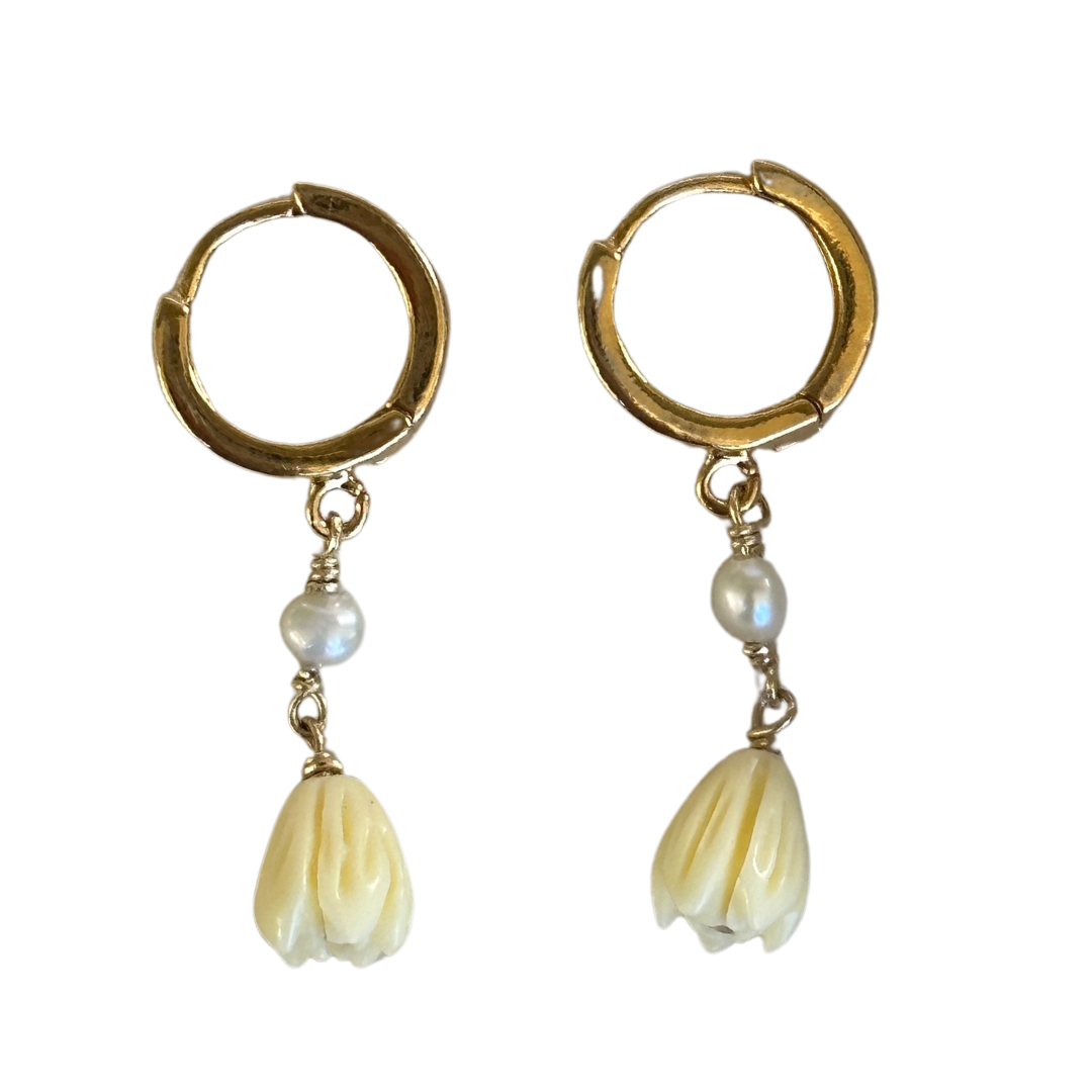 Pikake and Pearl dangle about 3/4 of an inch below huggie